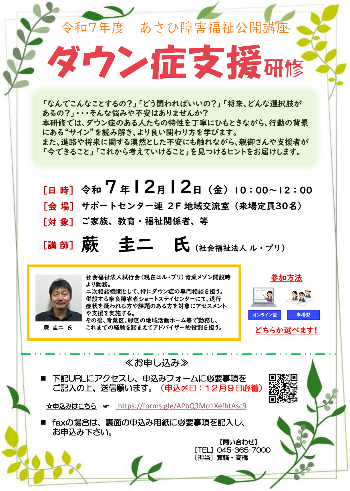【研修の案内】あさひ障害福祉公開講座 『ダウン症支援研修』