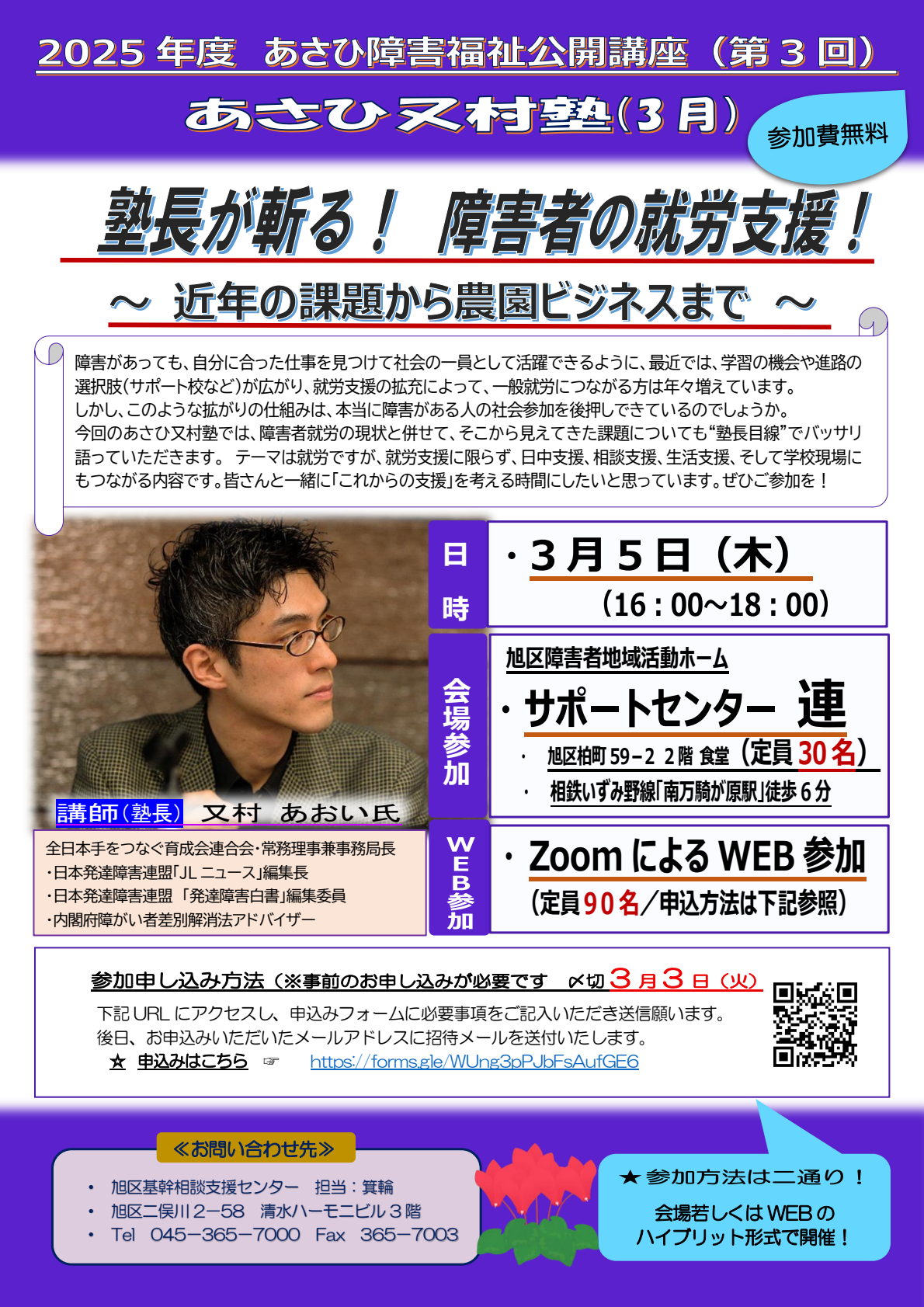 3月のあさひ障害福祉公開講座は、「塾長が斬る!障害者の就労支援~近年の課題から農園ビジネスまで~」!