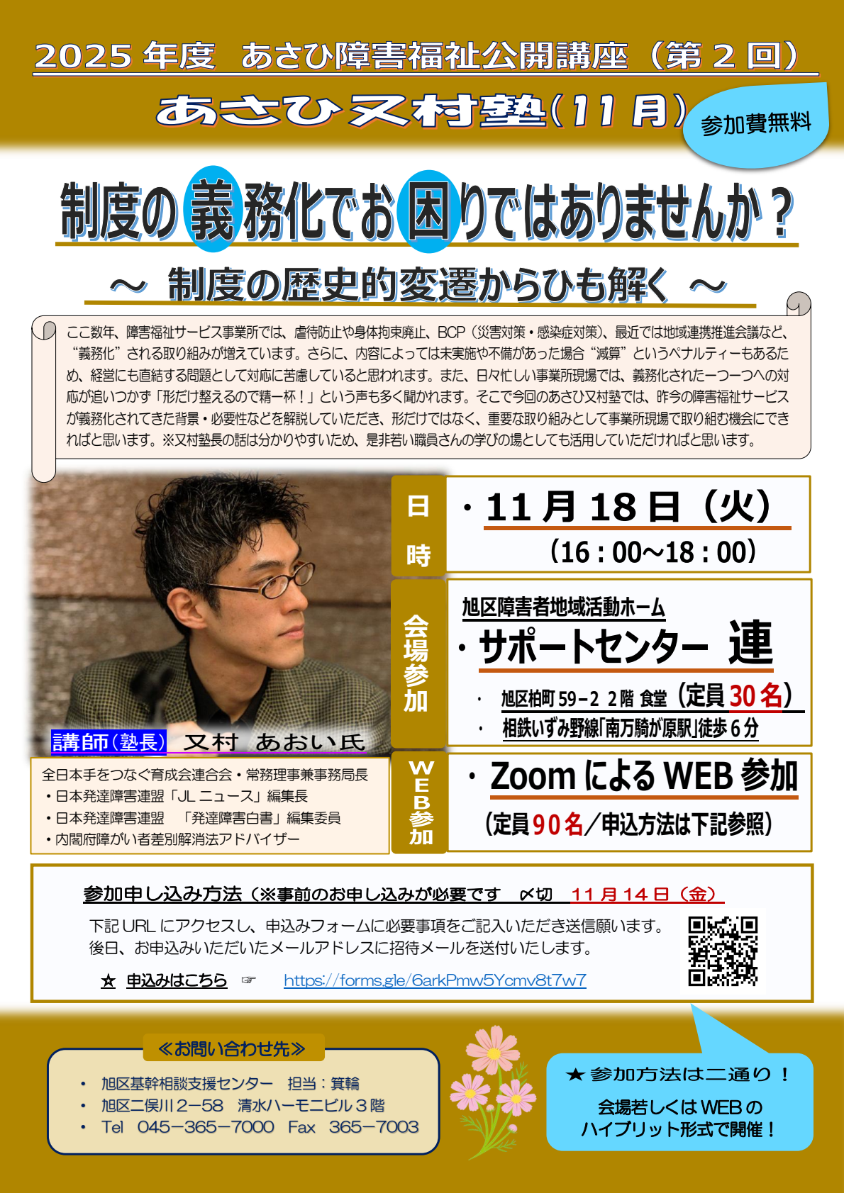 【研修の案内】あさひ障害福祉公開講座 『障害のある人の「親なきあと」を考える~「いつか」ではなく「今」でしょ!~』