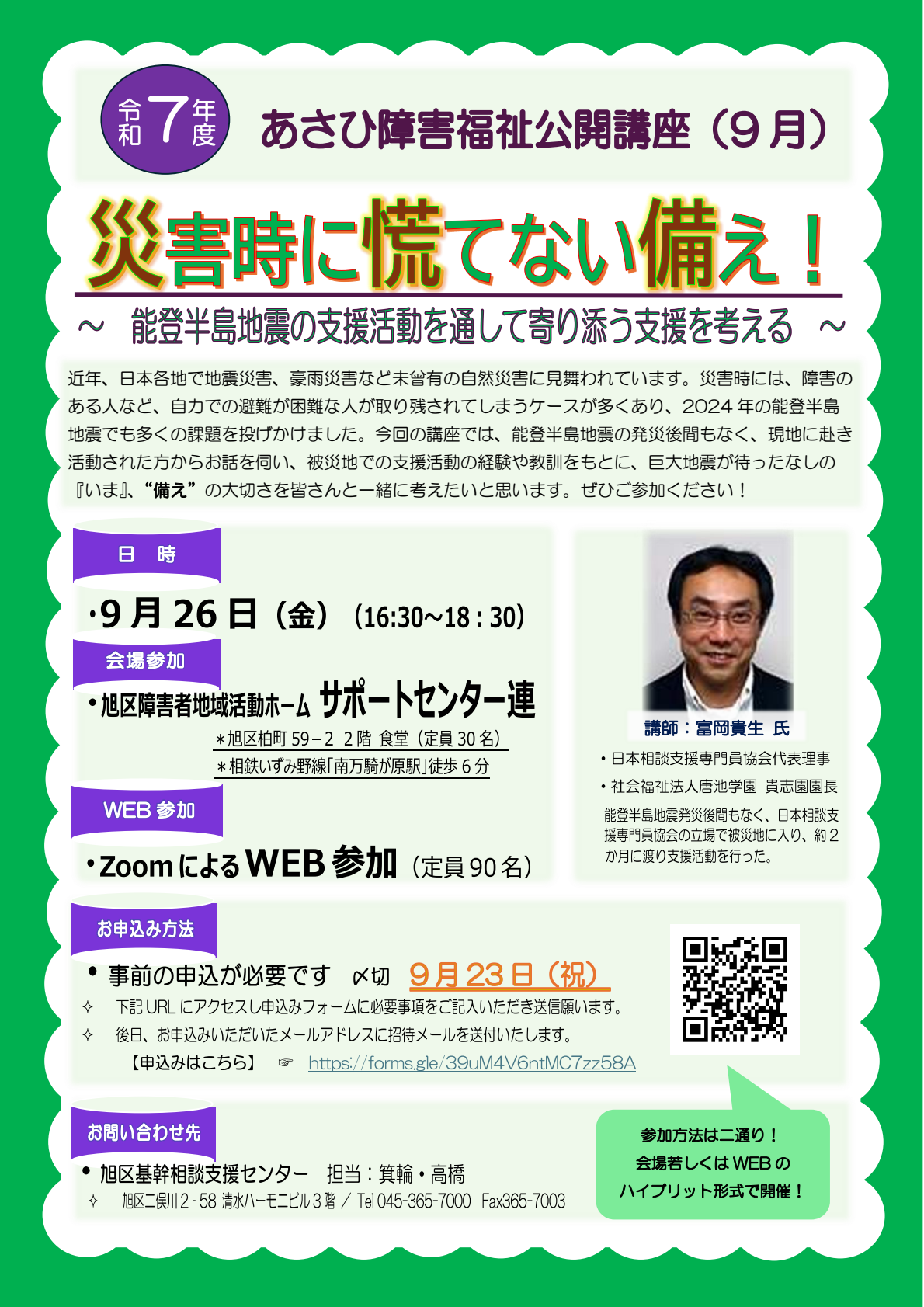 【研修の案内】あさひ障害福祉公開講座 『災害時に慌てない備え~能登半島地震の支援活動を通して寄り添う支援を考える~』