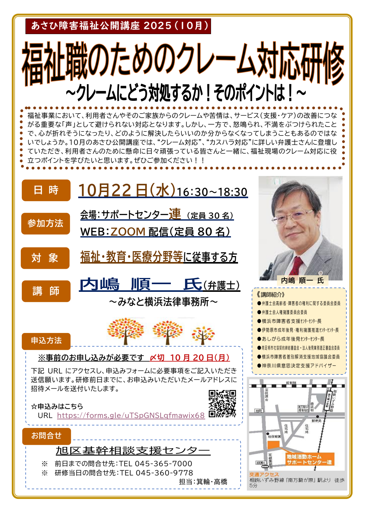 【研修の案内】あさひ障害福祉公開講座 『福祉職のためのクレーム対応研修~クレームにどう対処するか!そのポイントは!~』